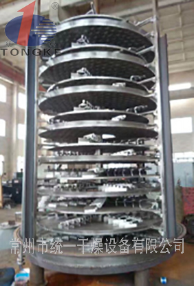案例概述:一、統一干燥四氯苯醌專(zhuān)用盤(pán)式干燥機概述:四氯苯醌干燥機的濕物料自加料器連續地加到干燥器上部第一層干燥盤(pán)上,帶有耙葉的耙臂作回轉運動(dòng)使耙臂作回轉運動(dòng)使耙葉連續地翻抄物料。物料沿指數螺旋線(xiàn)流過(guò)干燥盤(pán)表面,在小干燥盤(pán)上的物料被移送到外緣,并在外緣落到下方的大干燥…